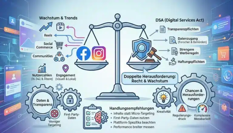 Die Social-Media-Welt ist in Bewegung. Während Plattformen wie Instagram und Facebook seit Jahren das digitale Marketing dominieren, verändert der Digital Services Act (DSA) die Spielregeln. Gleichzeitig entwickeln sich Nutzerzahlen, Engagement und Trends rasant weiter. Unternehmen stehen damit vor der doppelten Herausforderung: Rechtliche Vorgaben einhalten und Wachstumspotenziale nutzen.